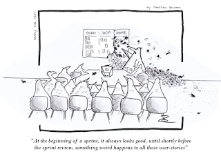 These are the made up stories of a team working in an Agile environment. Their daily struggles and successes are presented in a comic/parody/satirical way. Click on the image to see it in full size.